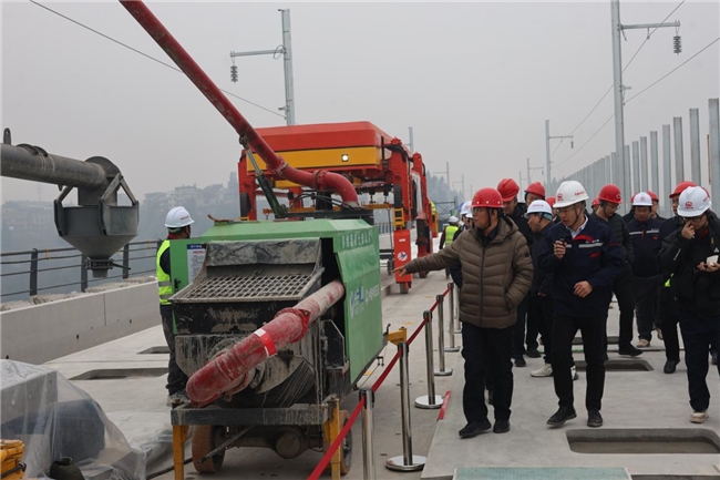 观摩了无砟轨道数智混凝土布料车双线布料和平面混凝土转运示范操作。实现了大长隧道和桥梁平面运输跨工作面快速连续转运难题。