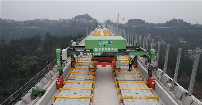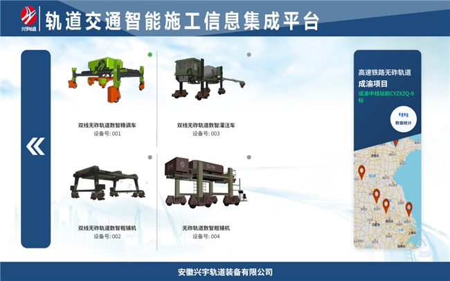 成渝中线400km/h区段无砟轨道由中铁五局集团承建,智能建造系统集成装备由安徽兴宇轨道装备有限公司和中铁五局合作开发,于2026年元月1日在成渝中线四川段9标首件段开建。首件段兴宇轨道投入:双线无砟轨道数智精调车、双线无砟轨道数智粗铺机、单线无砟轨道数智粗铺机、无砟轨道数智混凝土布料车及混凝土转运机等智能建造系统集成装备;免打孔组合式模板、数智精调支护装置、一体化防上浮压杠等全工作面工装;轨道交通智能施工信息集成平台和服务支持人员。